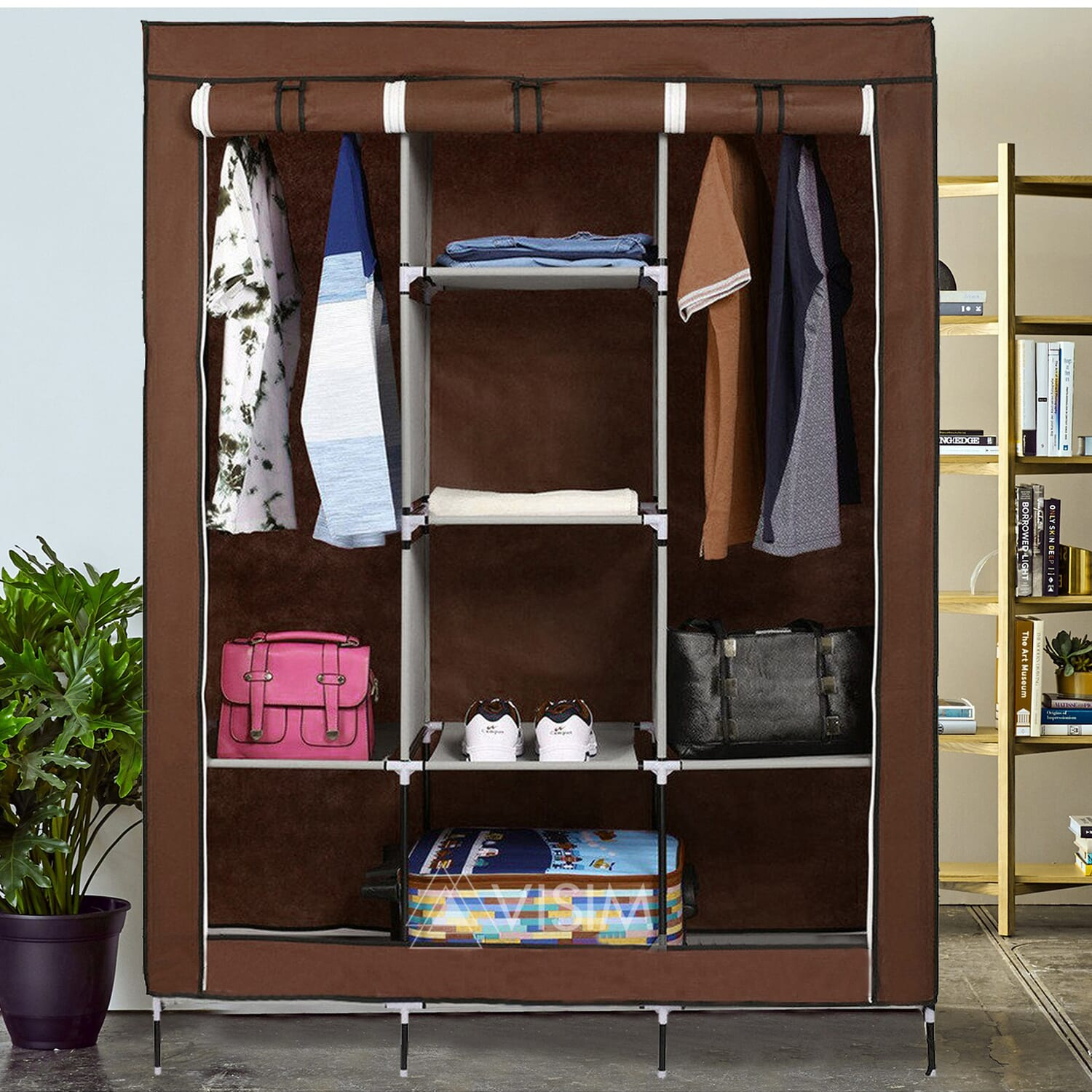 - Beautifully designed and innovatively crafted modern design. With Movable clothes hanging rod and 8 storage shelves offers you enough space both for your longer outfits and folded clothes